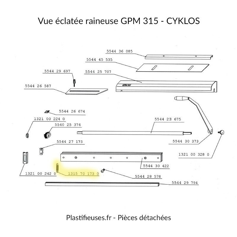 Cette pièce est essentielle pour maintenir la performance de votre matériel de façonnage. Le ressort (Réf. 315 70 173 0) est une pièce d'usure critique qui assure le rappel du mécanisme de pression après chaque opération de rainage ou de perforation sur la Cyklos GPM 315.